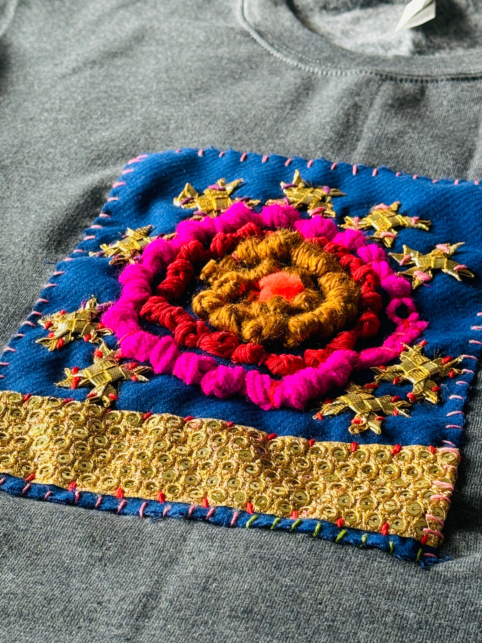Each piece is gota, colour, wool and fibre stitched with lots of love and hope.