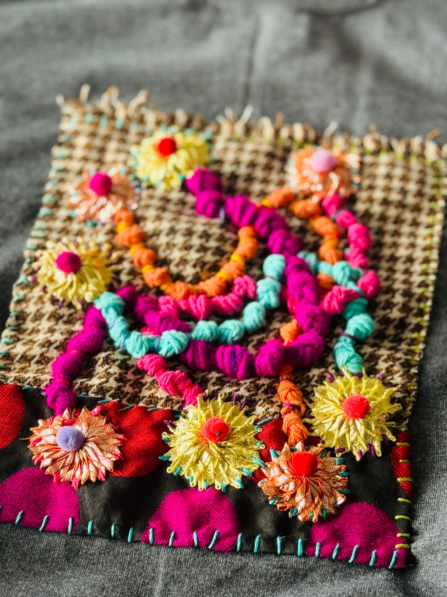 Each piece is gota, colour, wool and fibre stitched with lots of love and hope.