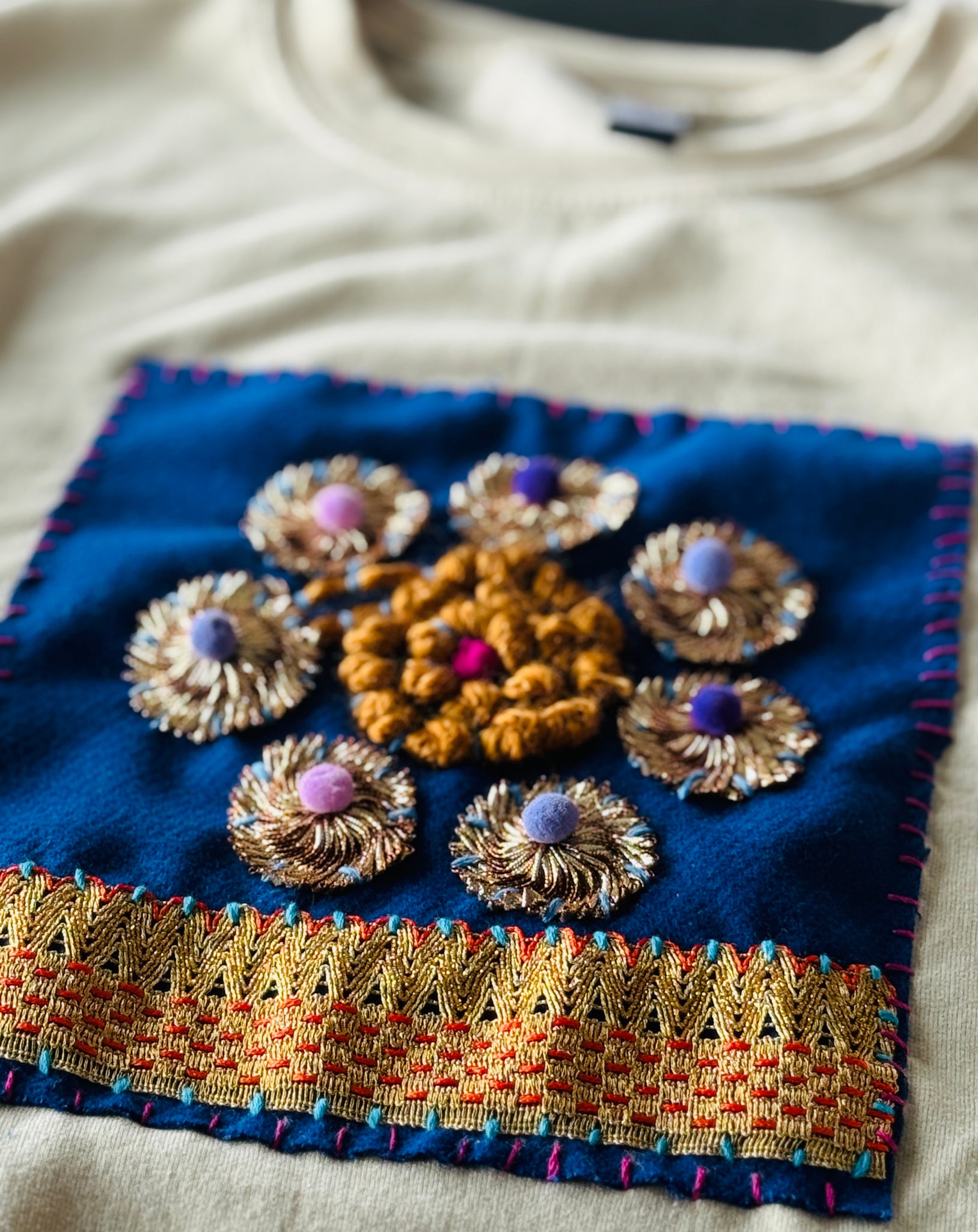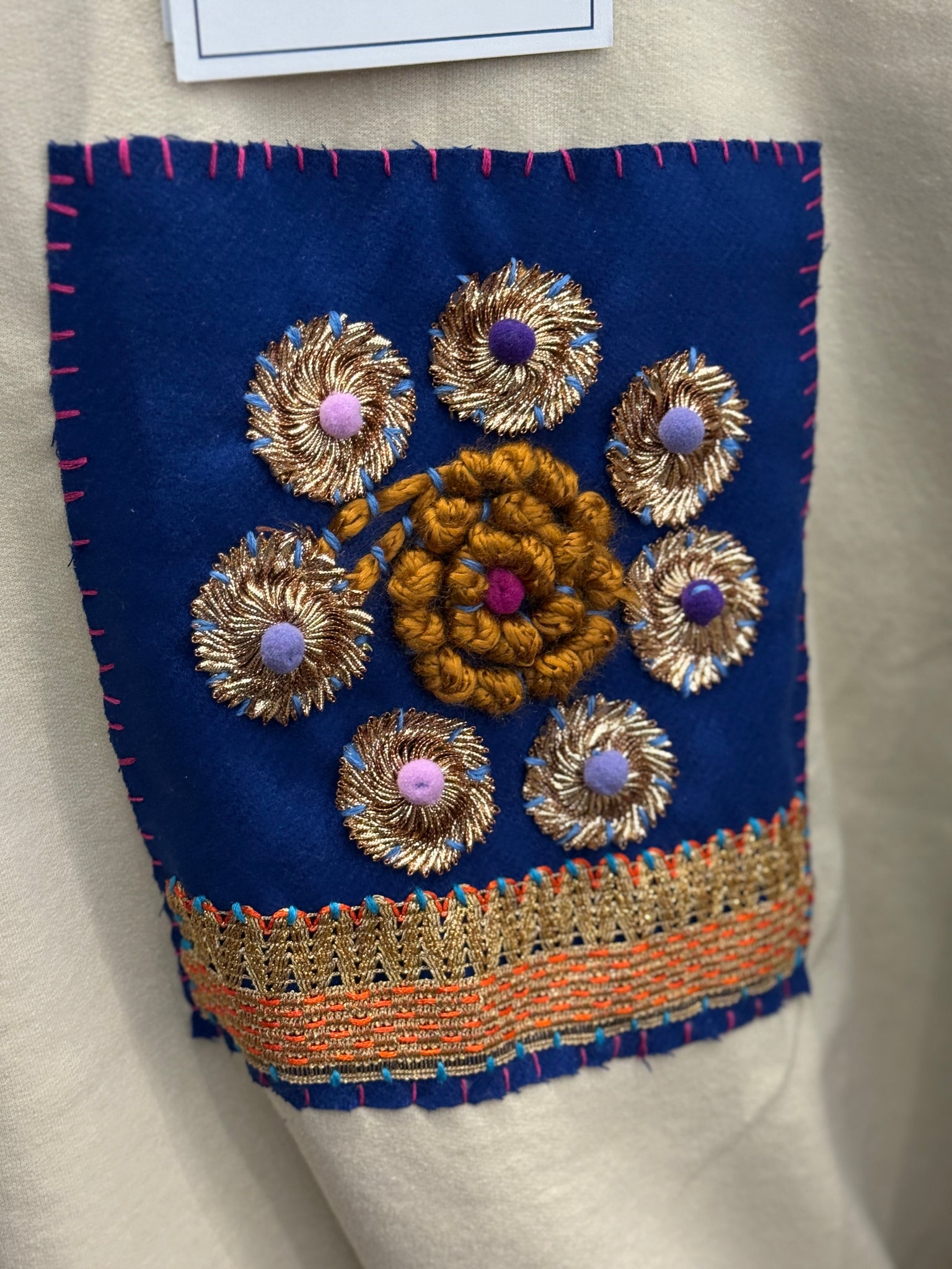 Each piece is gota, colour, wool and fibre stitched with lots of love and hope.