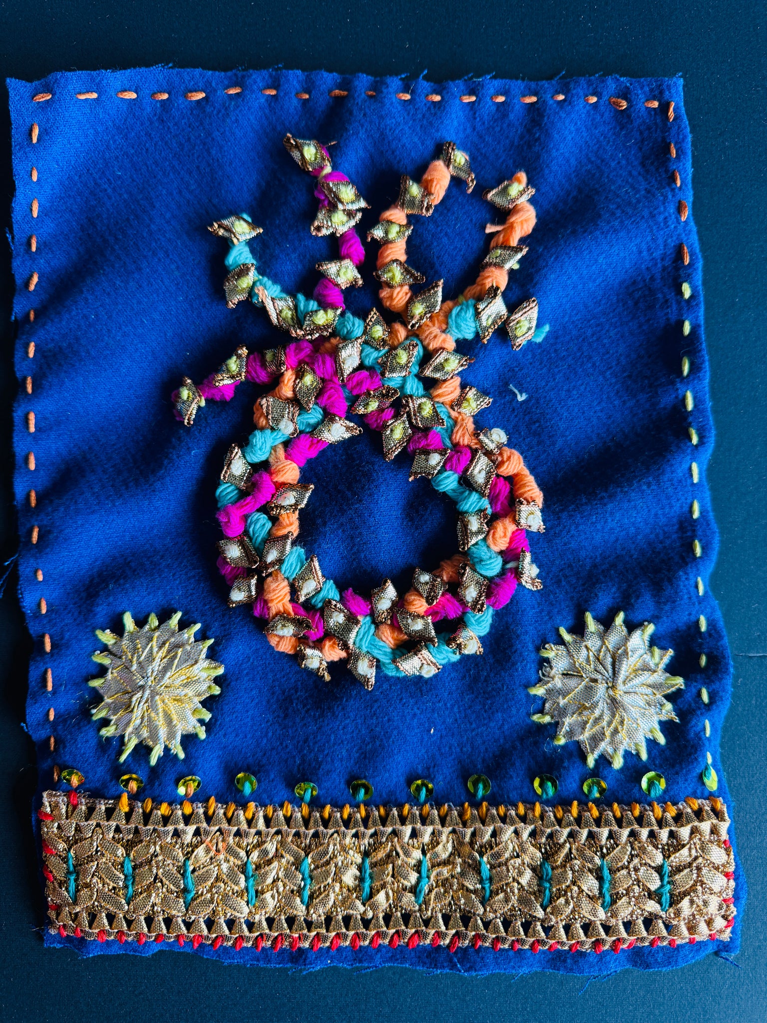 Each piece is gota, colour, wool and fibre stitched with lots of love and hope.
