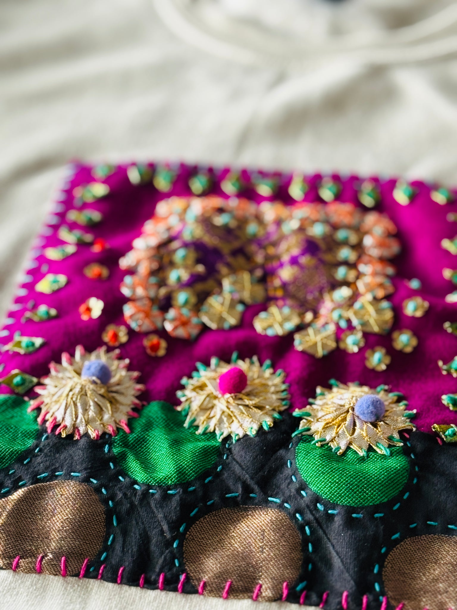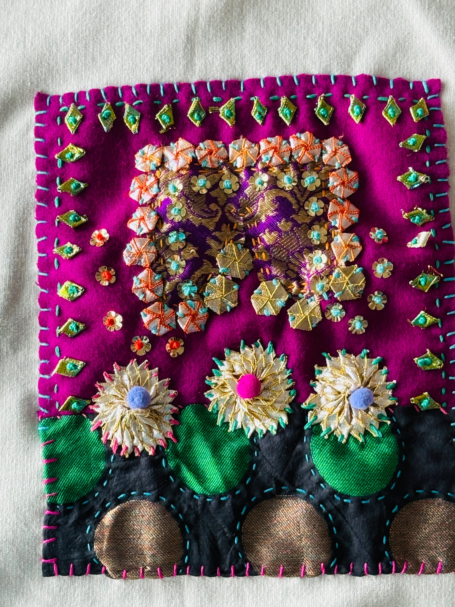 Each piece is gota, colour, wool and fibre stitched with lots of love and hope.