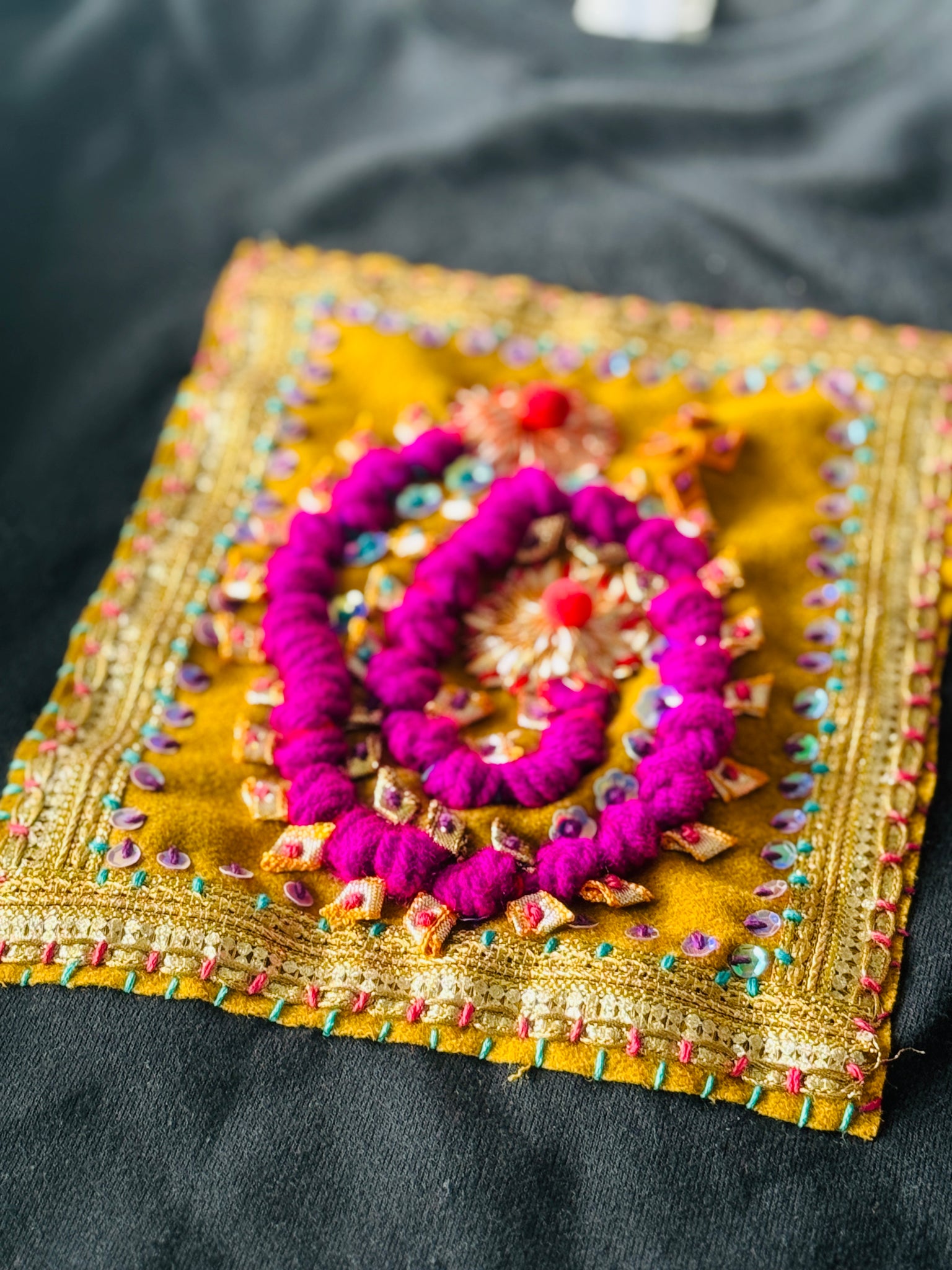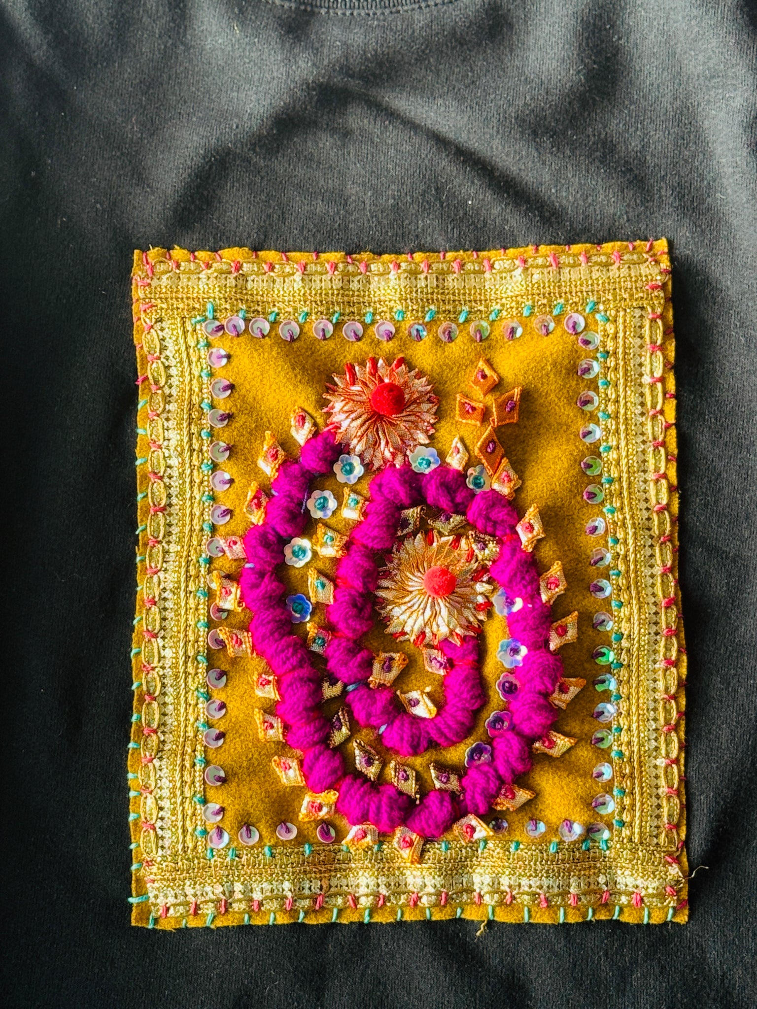 Each piece is gota, colour, wool and fibre stitched with lots of love and hope.