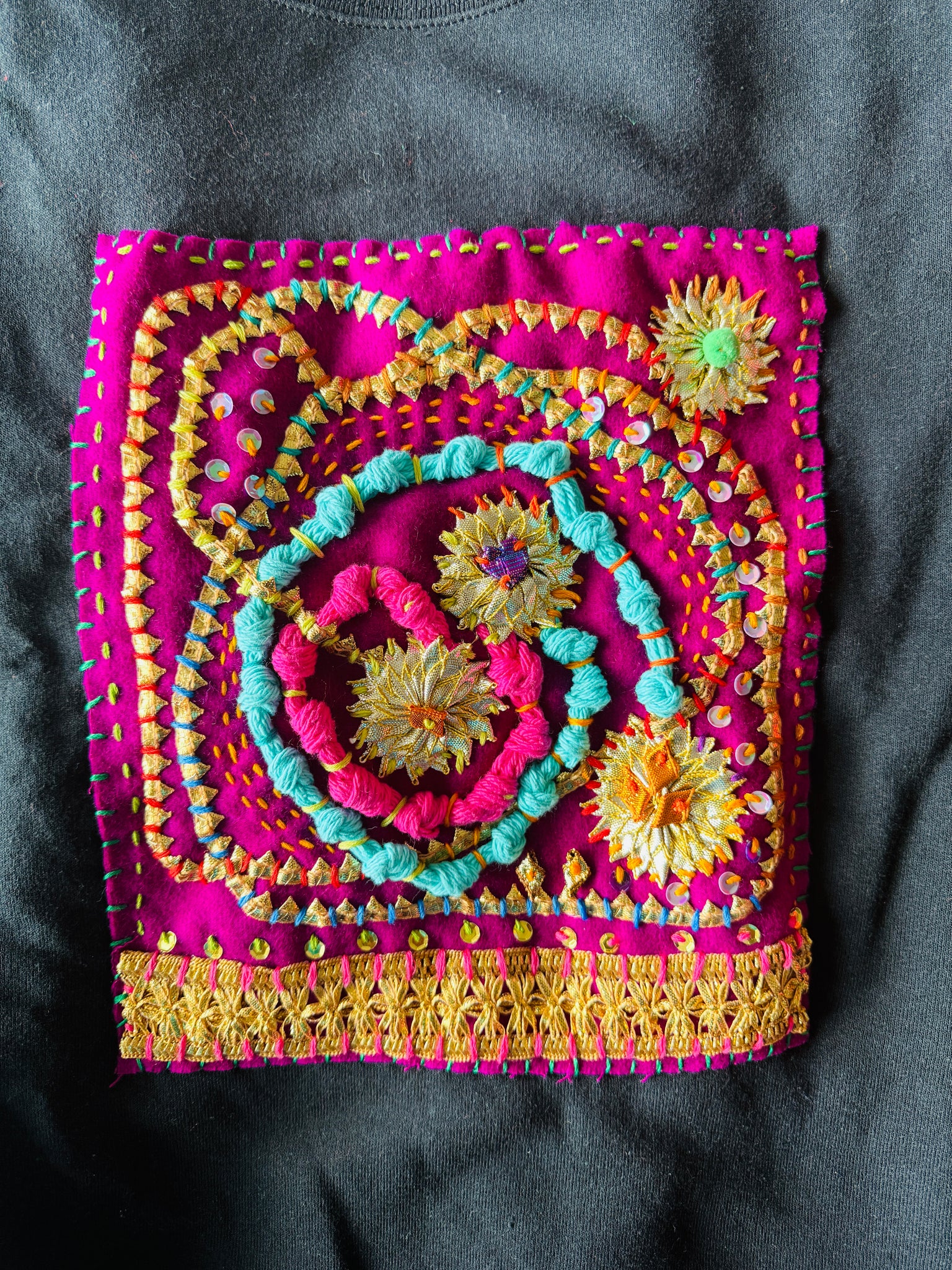 Each piece is gota, colour, wool and fibre stitched with lots of love and hope.