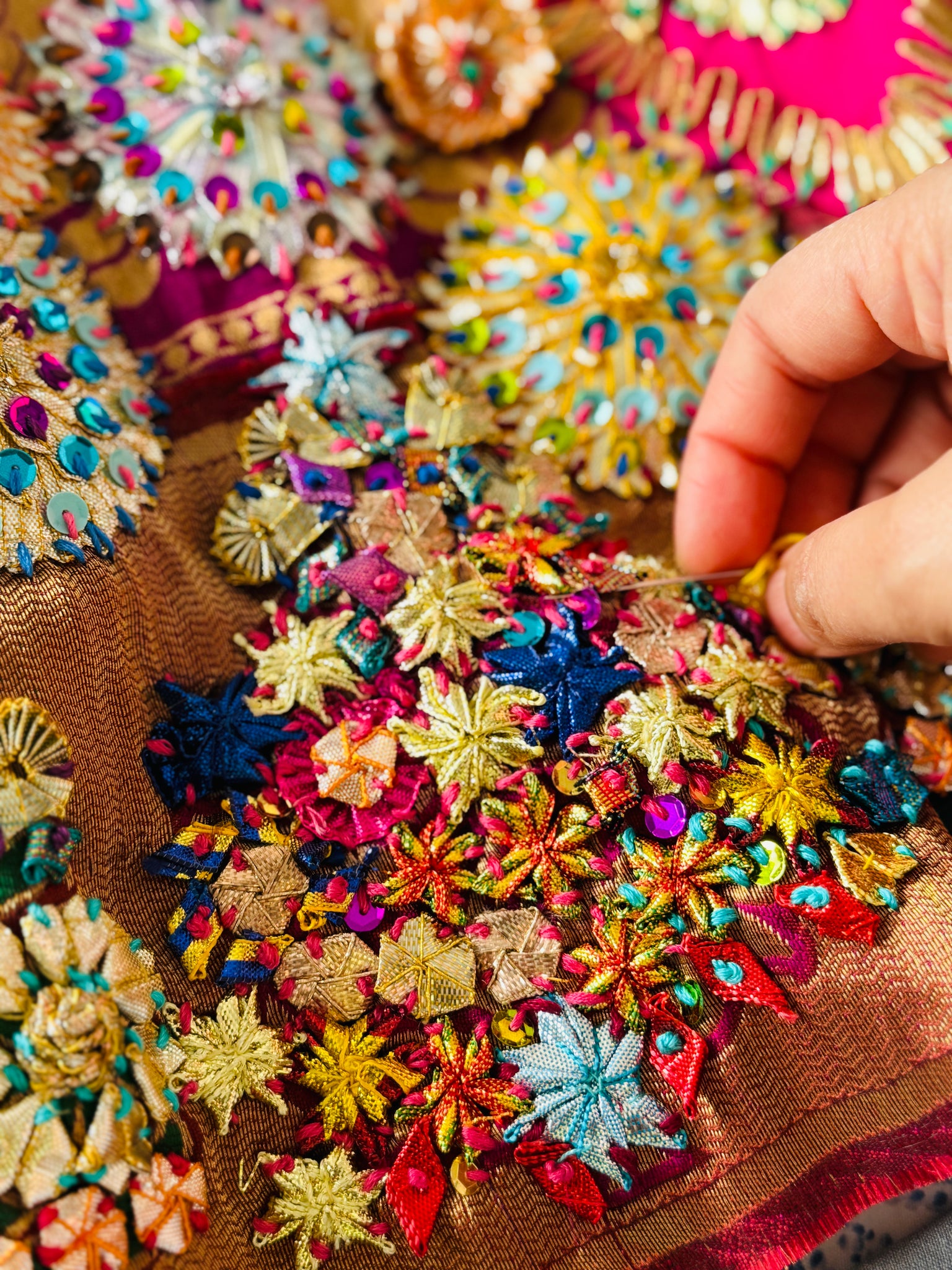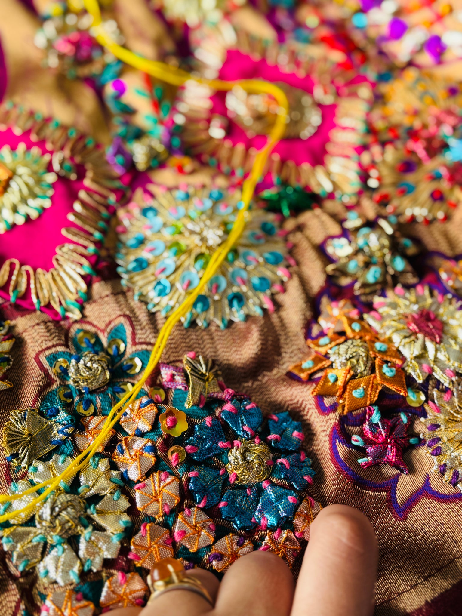 The heavy on the dupatta is appliquéd on to keep the loose threads secure. Each dupatta is completed in a duration of 8-10 weeks.